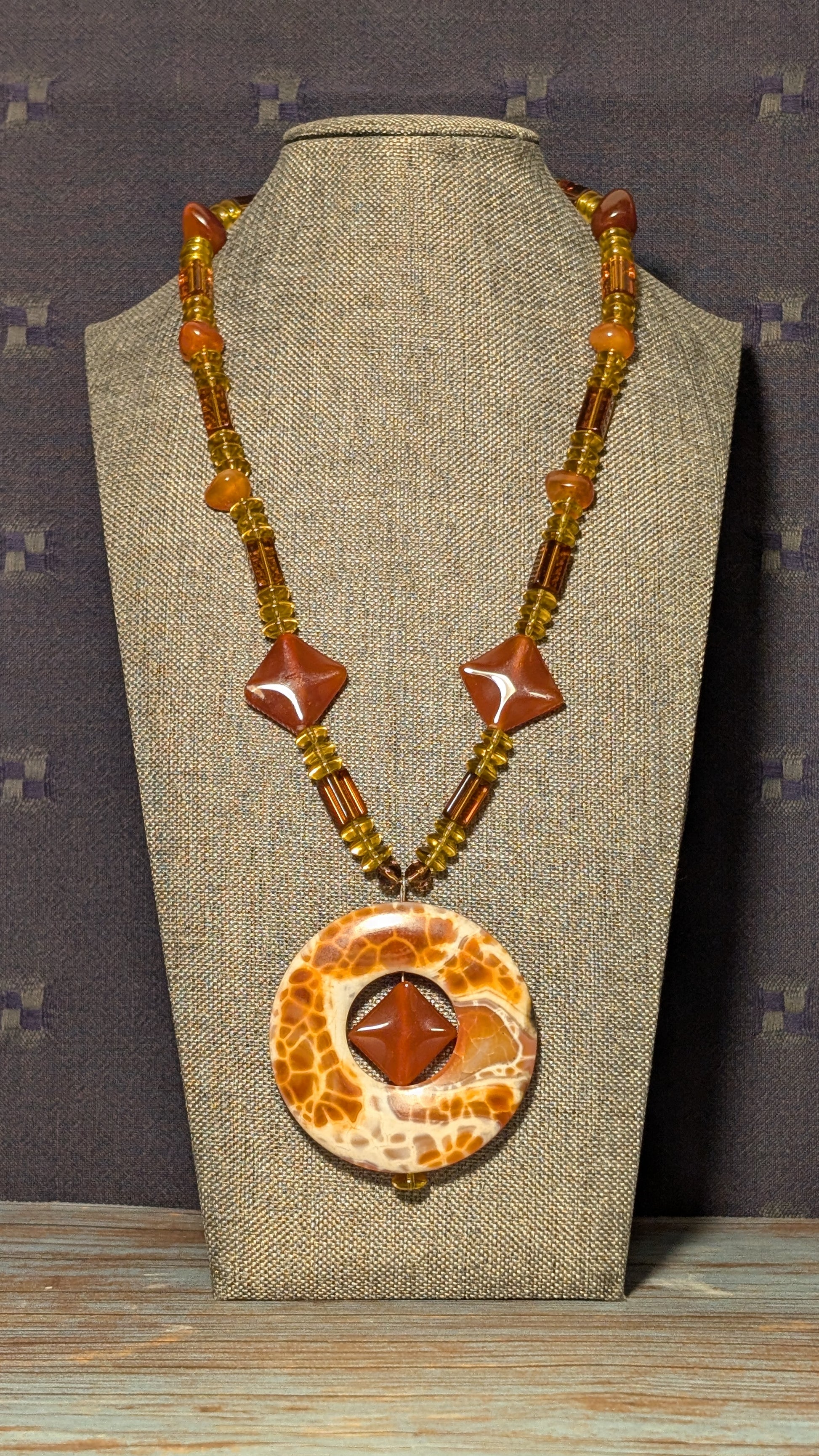 This necklace showcases a vibrant mix of carnelian, carnelian agate, and warm-toned glass beads in rich amber and rust hues. The smooth carnelian stones and shimmering glass accents create a beautiful flow, while the large circular carnelian agate centerpiece adds an eye-catching, organic focal point with natural patterning.