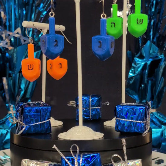 Colorful Hanukkah-themed earrings made from miniature dreidels, the four-sided spinning tops traditionally used during the Jewish holiday of Hanukkah.