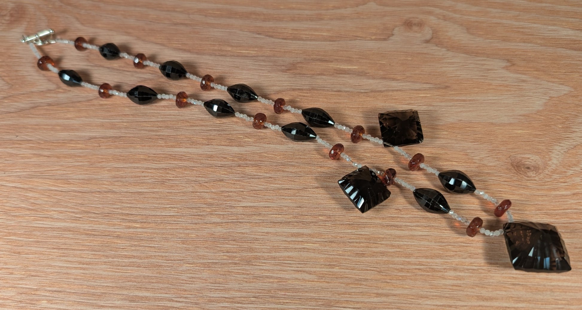 Smoky Quartz, Black Spinel, Hessonite Garnet and Rainbow Moonstone Necklace FN36